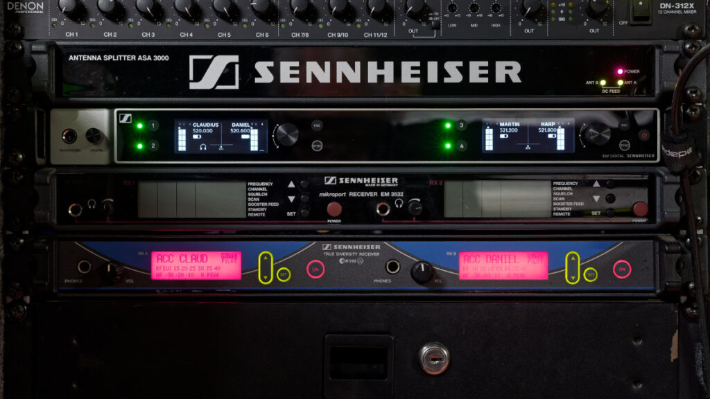 Im Bühnenrack von Gitarrist Bernd Römer arbeitete ein Sennheiser-Doppelempfänger EM 2050 mit insgesamt sieben Taschensendern, die den unterschiedlichen Instrumenten des Gitarristen zugeordnet waren. Alle Transmitter liefen auf derselben Frequenz und wurden beim Gitarrenwechsel vom Backliner per HF-Mute deaktiviert. So blieb die Bedienung im laufenden Konzertbetrieb pragmatisch und übersichtlich.